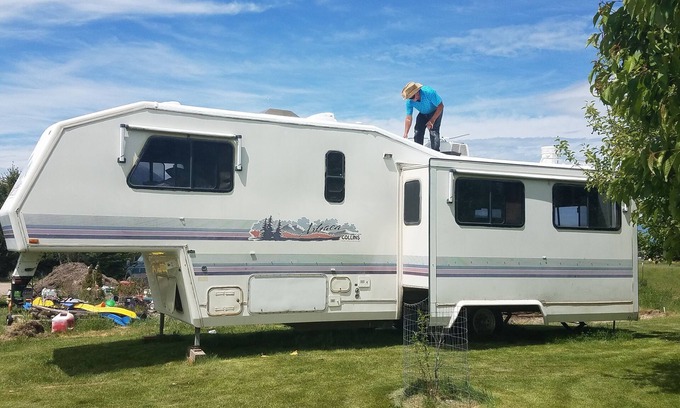 1993-26 ft. 5th wheel RV/ Slide out/Oak cabinets. View of orchard & Fish Pond, ASK first....Catch & release fishing weather permitting , Gazebo. Kitchen, Queen bed + hide a bed pull out/, 1 Bath & towels, A/C, NO Wifi, TV limited reception, No satellite, Microwave, RV Frig and SMALL Oven. Clean, Outdoor eating available, games. Property has farm animals, peacocks and pea fowl, small dogs, a cat, Horses, steers, chickens and a turkey. Wildlife are possible to see as well. No Smoking, No Vaping, No Alcohol, No Hard cider, No events or Parties. Liability issues. Fine for violation is $500. It is not worth us loosing our insurance because guests feel they are entitled to do what they want to do. If that sounds harsh, then please rent some where else. Thank you.
