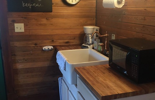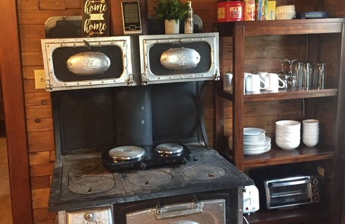 Our cabin comfortably accommodates 4 people. The one bedroom has a gorgeous queen size sleigh bed and the living room has a queen size sleeper couch. There is one bathroom with a vintage clawfoot style bathtub and shower. The cute kitchenette has its original wood burning stove (not for use) however we have a double burner hot plate, toaster oven, toaster, and microwave for cooking! As coffee lovers, we have supplied all of your coffee, creamers, and sugars on the pantry- so help yourself! We also have Wifi and TV available. Or sit outside in our screened-in, covered patio and enjoy the peaceful sounds of nature!