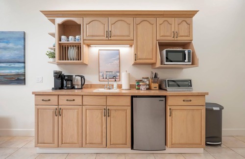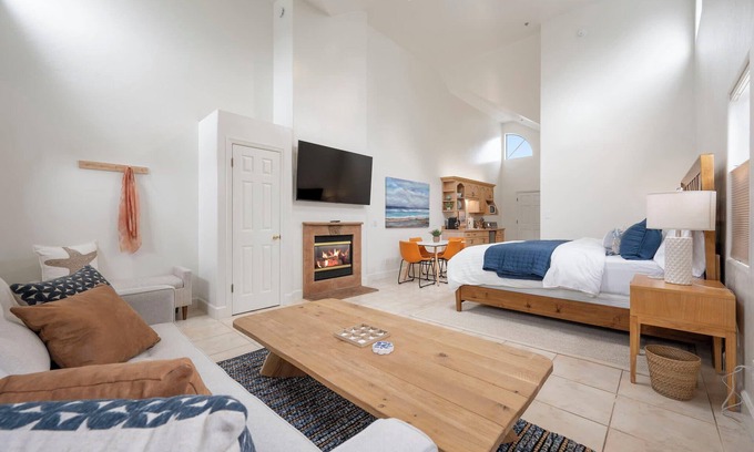 Located above the heart of historic downtown Half Moon Bay, the Montara Penthouse offers a warm and inviting coastal retreat. This airy, high-ceiling suite features a plush king-size bed, a spa-style bathroom with a relaxing jacuzzi tub/shower combo, and a bright living room complete with a cozy fireplace, flat-screen TV, and comfortable sofa bed—perfect for couples or small groups seeking comfort and charm by the sea. A compact kitchenette with an under-counter refrigerator, single-element black induction cooktop, blender, kettle, toaster, coffee maker, microwave, and basic kitchen essentials. Step outside to your private back deck—an ideal setting to enjoy morning coffee or a glass of wine while taking in the ocean air and elevated views over the rooftops of downtown Half Moon Bay.