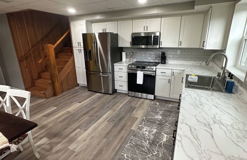 If you're looking for a peaceful and relaxing cabin spot on acreage with beautiful views and close to Montauk state park or many other water activities then look no further. This 4 BR/2 BA 1,700 sq feet place has been newly renovated to include all of the necessary amenities while on vacation. A fully stocked and updated kitchen, two bathrooms (one shower, one tub/shower combo), a massive living room with comfortable couches looking towards a 65 inch smart tv. Just 3 miles from Montauk!!