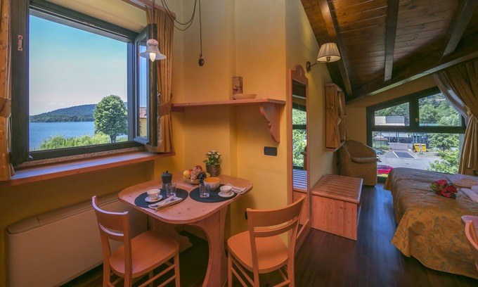 Inside, the cute and cosy studio offers far reaching views across Lake Comabbio from its charming open plan living room, which features a sitting room with SAT TV, a kitchenette, dining space and adjoining open sleeping area with charming double bedroom and views of the residence.
