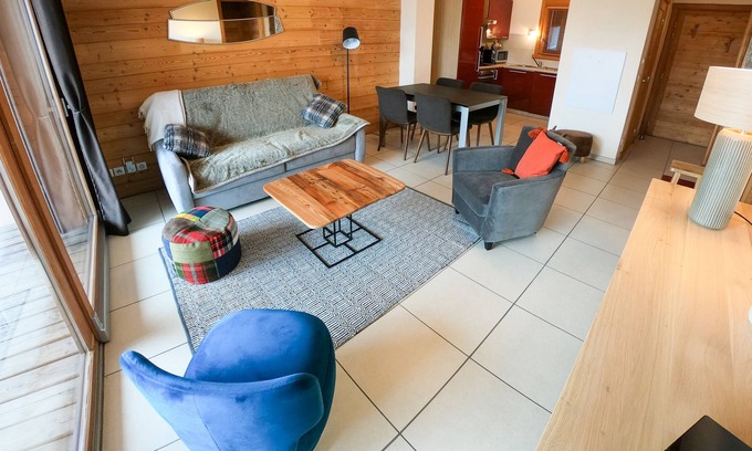In a comfortable and highly sought after chalet, apartment facing south 4/5 people. Private relaxation area directly in the chalet (Sauna, Hammam, jacuzzi & swimming pool) repairing after ski departure and arrival at the feet. "Piou-Piou" children's ski school in front of the residence for shared happiness for children and parents. Ski locker heated in local ground floor and wellness area for your car in private box in the garage in the basement.