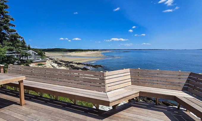 Oceanfront Deck: Relax and dine on the large deck perched on the rocks, offering panoramic ocean views, a private tidal beach, and Reid State Park in the distance.