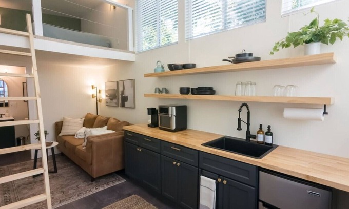 The Space: The tiny home is a charming and well-appointed tiny home nestled in the backyard of the main house on property, offering both privacy and accessibility to all of East Austin's hot spots! With 13' ceilings, it's filled with natural light and a layout designed to make the most of your tiny home experience. Enjoy the benefits of a cozy, yet surprisingly spacious environment. You'll also have access to a quaint outdoor deck—perfect for savoring your morning coffee or relaxing with an evening nightcap.