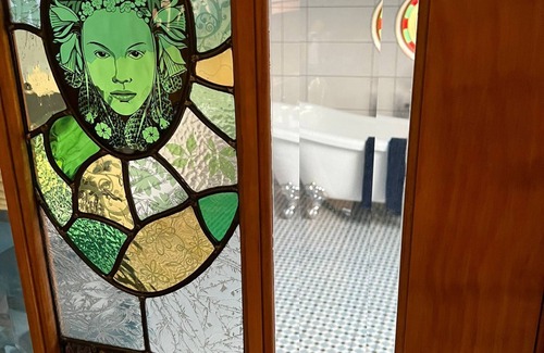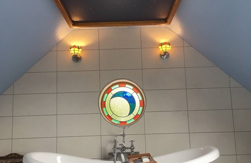 Our starry ceiling bathroom comes alive with tiny pin pricks of light under the smiling gaze of the blue moon stained glass window and our comfortable chaise lounge makes a cosy corner to browse our collection of esoteric books .