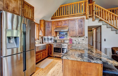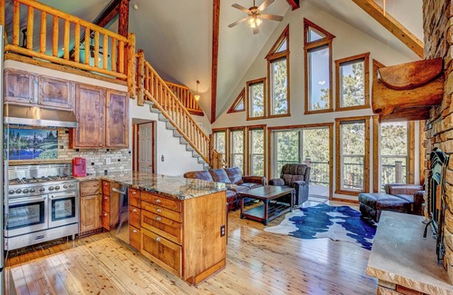 This extraordinary home features three beautifully appointed bedrooms, a loft sleeping area, and three full baths, making it perfect for accommodating up to ten guests. Imagine exchanging vows near beautiful rock outcroppings or celebrating with loved ones around the stunning stone fireplace in the expansive great room. The modern kitchen boasts granite countertops and stainless steel appliances, ideal for preparing delicious meals or hosting festive gatherings. Multiple common areas, including an outdoor Trex deck that wraps around the house, provide ample opportunities for relaxation and enjoyment, while the separate gym and craft area ensure everyone can unwind in style.