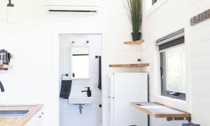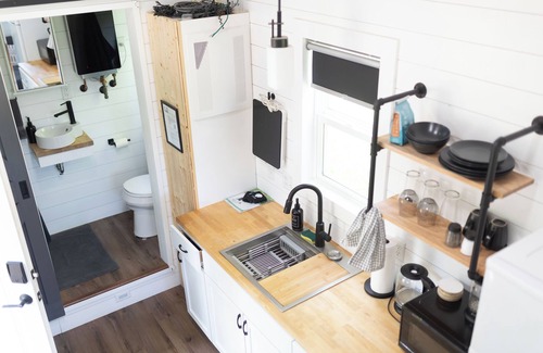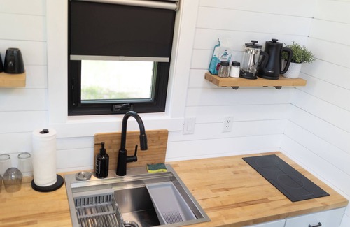 Escape to Titan at Moonbase, a moon-themed tiny house retreat in central Wisconsin! This tiny house is inspired by Saturn's moon Titan. It is located on 7 acres with one other moon-themed tiny home. Modern amenities include heating, AC, internet, and a smart TV. Immerse yourself in a unique, relaxing getaway with low-light pollution skies for star and moon gazing!