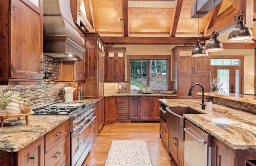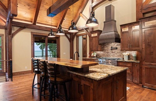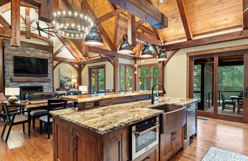 From the moment you step into the grand foyer, you're greeted by cathedral ceilings and an open-concept living, dining, and kitchen area that feels both spacious and intimate. The living room invites you to sink into plush leather sofas or cozy king chairs while enjoying the gas fireplace, big-screen TV, and sparkling lake views. Sliding doors make stepping outside effortless, whether you're heading to the deck for morning coffee or an evening cocktail. The dining area, anchored by a rustic table for eight, flows into a chef's kitchen built for memorable gatherings, complete with top-of-the-line integrated appliances, a six-burner gas stove with dual ovens, and a large island with seating for three.