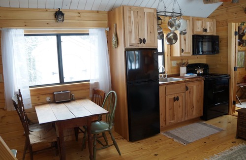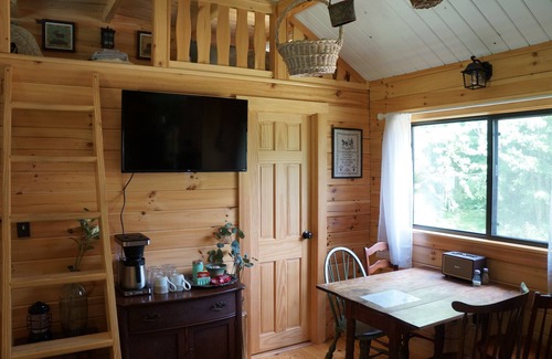 Inside our fully log cabin you will find a first floor bedroom with 1 queen bed and a small workspace with a desk, a loft with 2 twin beds accessible via ladder, 1 full bathroom, a full kitchen stocked with pots, pans, plates, bowls, glasses and utensils, a small dining area that seats 4, and a living area with a loveseat sofa, bench and a Roku TV with guest mode where you can easily and temporarily sign-in to all of your personal streaming services. If you have a small child we do have a pack and play available in the laundry room at all times. We also have a ladder guard available to prevent climbing of the loft ladder and can set it up prior to your arrival with notice (it is always available in the utility room). There is also a spacious front porch that spans the front of the cabin, facing into the clearing and featuring tables and seating.