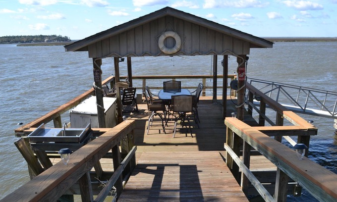 Cool rustic with modern upgrades! Rare direct waterfront coastal cabin located 35 minutes south of historic downtown Savannah in a serene coastal environment in Colonels Island GA. Sitting on a bluff on the vast North Newport River, this direct waterfront cabin offers spectacular river views, not to mention colorful sunsets. The cool rustic décor, rare woodwork in all rooms and wooden beams in the vaulted living space make this cabin a very special and memorable waterfront rental. Feel like you are back in time away from all the hustle and bustle. Relax with a cocktail on the deck or dock. Bring your boat and dock at the private COVERED deep water dock. Explore the barrier islands by boat or charter a trip with a local captain. Bring your poles and fish directly off the private dock. Or if you would like to go the beach by car, head north 50 min to Tybee Island or south 50 minutes to Jekyll Island or St Simons Island. Explore the historic sites in nearby Savannah GA and then come back to this cabin and grill out with the family in a peaceful setting. The very nicely appointed cabin with 3 bedrooms and 2 full baths comfortably sleeps 6 guests. Its rustic but very nice with all the new modern touches including brand new appliances, cool coastal décor and quality home goods/linens. You won't be disappointed with the MOONSHINE CABIN! Check out my reviews on my other properties listed by me on VRBO and you will gain a comfort level that we take great care of our guests. If you have a larger group, please note you can combine this house that sleeps 6 with another rental close by that sleeps 8 for a total of 14 guests. 6 guests maximum in this Moonshine Cabin.