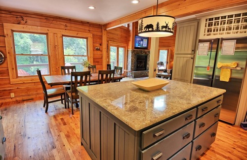 The beautiful and spacious fully stocked kitchen has the modern conveniences such as a dishwasher, griddle, Keurig maker, fridge, electric oven, cookware, dinnerware, large granite countertop island and almost everything needed to prepare a meal. The dining area can accommodate up to 4 guests and there is additional seating at the kitchen island. Feeling hungry? You can cook up your favorite steaks using one of three grills. We offer a regular gas grill, a Blackstone griddle and a charcoal grill (by the river).