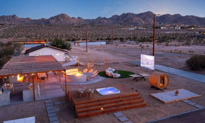 Best-rates for the Joshua Tree house starts from $2,747 per night with includes Balcony/Terrace, Entertainment, Kitchen, Laundry, Pet Friendly, Pool, Private Pool, Fireplace/Heating, Guest Services, Air Conditioner, Parking, TV, Sports/Activities, Bedding/Linens, Barbecue/Outdoor Cooking, Child Friendly, Hot Tub, Security/Safety, Wellness Facilities, Internet with all other amenities. Perfect for Weddings is committed to ensuring every guest experiences a comfortable and extraordinary stay, whether planning a romantic getaway, a honeymoon, a pet-friendly stay, or celebrating with the entire wedding party.