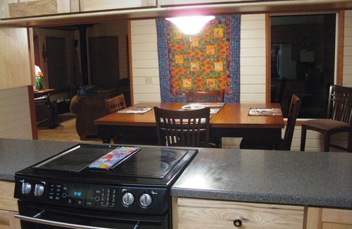 The Moonstruck Mermaid is owned by two artists who come to the home frequently to get inspiration for their glass and quilt art. You will see examples of their art throughout the house. The home has hardwood and ceramic tile flooring with cedar ceilings and walls throughout. As soon as you walk thru the door into the gathering room of the home your shoulders will feel lighter. The Moonstruck Mermaid has both a living room and a gathering room with game table. Our guests have enjoyed being able to watch a movie in one room and listen to music in the other. We provide HBO, Showtime, Cinemax, and On Demand for those evenings when it feels so good to just kick back and be entertained. The gathering room has a cedar cathedral ceiling with three skylights; you can watch the moon travel across the evening sky thru the skylights. There is a wall mounted 50' HDTV with DVD player. This room also has a full size sleeper sofa that will comfortably sleep two, two leather recliners and a game table. Further there is a wet bar fully stocked with glassware, cocktail shakers, ice bucket, etc. Also there is a half bath off this room and an outside courtyard with morning sun.