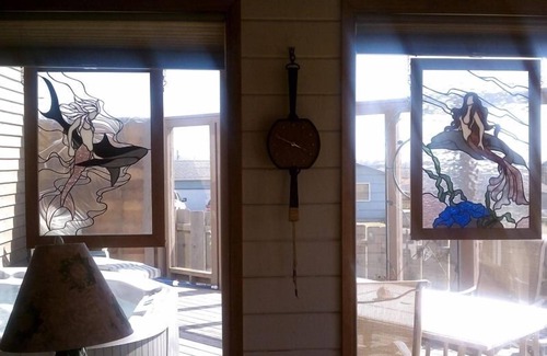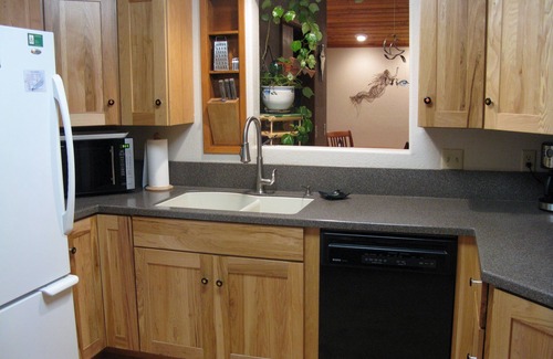 There is a pass thru from this room into the newly remodeled kitchen with a JennAir convection range. There is even a crock pot to simmer a winter stew whilst you are on adventures during the day. The ocean view dining room will comfortably seat six. The living room also has a cedar cathedral ceiling, fabulous ocean view, woodstove, a 50' flat screen with DVD player and opens onto the expansive ocean view glassed in deck. The ocean view master bedroom has a queen pillowtop bed, large closet, 37 ' flat screen HDTV and also opens onto the deck conveniently close to the hot tub. The ocean view second bedroom also has a queen wrought iron canopy bed with handmade mermaid quilt. The large main bathroom has a bathtub/shower combination. The glass tile countertop and knobs in the bath were created by the owners. And finally, there is a utility room with washer and dryer.