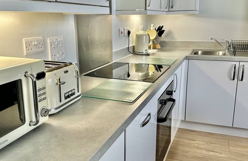 One bedroom, with king size bed and en-suite. Fully equipped kitchen. Washer/dryer. Fridge freezer. Dishwasher. Complimentary tea and coffee. Iron and ironing board. Hairdryer. Towels and linen provided. No smoking. Family friendly. Travel cot available upon request. Free on street parking. Cycle store.