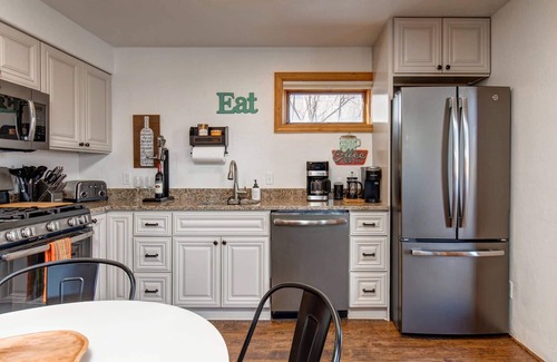 The full kitchen boasts new light grey cabinetry, granite countertops and stainless-steel GE Profile appliances. The kitchen is fully equipped with everything you’ll need to make a full meal, grab a quick snack or plan a delicious BBQ. There is a full set of Rachel Ray cookware, bakeware, dishware, silverware and glassware which include a colorful plastic dishware set for the little ones in your group. There is a coffee corner with a Braun coffee pot, a Keurig, a French press and a grinder to satisfy all coffee drinker’s preferences and sufficiently caffeinate for the day! For those wine connoisseurs, there is a stand-alone new “antique” wine opener, beautiful stemware and even a set of unbreakable wine glasses to take outside. The kitchen also has a Cuisinart 4-slice toaster, a sharp knives set, a tea pot, a crockpot, a waffle iron, a Ninja personal blender and basic spices/oils as well as basic cleaning supplies. The kitchen table seats 4 and there are trays available to use for additional guest or dining in other areas of the home.