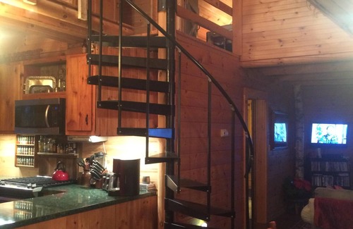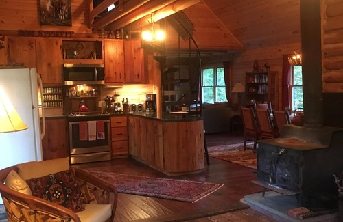 Moose Pond Cabin is the perfect romantic get-away for couples, a great place to enjoy close friends, or wonderful family bonding place. We provide attention to cleanliness, privacy, beautiful cabin decor, attention to detail for your comfort, and always personal and helpful service. Nestled away in the woods, our rustic log cabin with 3 bedrooms & 2 bath, that sleeps up to 8. The first floor offers one queen bedroom, light and bright cathedral ceiling fully equipped kitchen, dining room, living room, and family room that allows for great conversation and activity flow. The second floor includes two bedrooms, connected by a bridge. One with a king bed and the other a custom-built bunk room, great for the kids. The cabin sits on 8-wooded acreage, offers a small pond (non swimmable) frequently visited by Moose, trails for hiking, skiing, snowmobiles, snowshoeing, sledding and watching the abundant wildlife. In Summer, Spring or Fall our spacious yard is perfect for outdoor games. Swing in the hammock, cook out on the grill, sit around the fire pit in the evening and watch the stars go by.. and most of all, enjoy Peace and Tranquility! We love our Moose Pond Cabin, you can see more of us on our very own page of moosepondcabin . or like our face book page for more updates, Moose Pond Cabin! Great home where family and friends can get together for a rustic Vermont experience. PLEASE NOTE: Max. occupancy: 6 adults, or 8 people including children. * Please contact us for holidays rates. ** LINENS, PLOWING, TRASH & FIREWOOD INCLUDED. *** House is isolated and few cell phone carriers have a signal. (AT&T works okay) ***** 4 wheel drive necessary to access the property during inclement (i.e., snow or ice) winter weather.