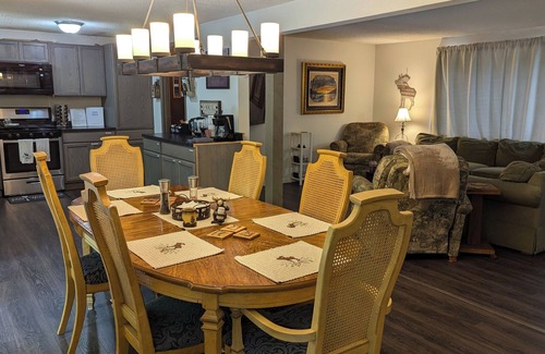 Moose Tracks Hot Tub Hideaway is fully equipped to be your home-away-from-home. The kitchen is furnished with all appliances including stainless steel refrigerator, dishwasher, microwave, griddle and gas stove, newer countertops, pots, pans, dishware, glasses, silverware, pantry items and seasonings and of course, all you need for coffee each morning! Enjoy your meals made in our fully stocked kitchen and share together around the dining room table or take it to the back patio for an epic barbecue. If cooking isn't your thing, there are 2 great restaurants less than a mile away!