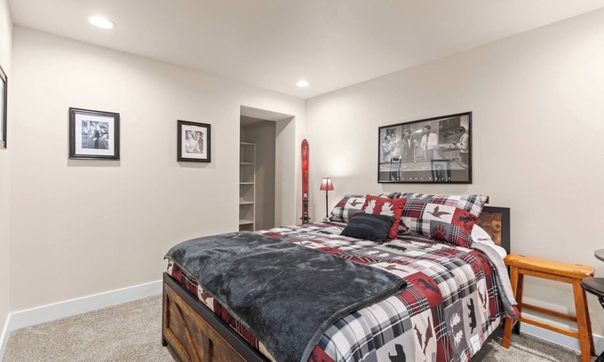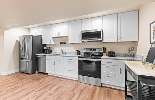 Our 2000 sq ft lower level, known as Moose Tracks Inn, features five beautifully furnished bedrooms and two bathrooms, offering plenty of room for everyone. The fully equipped kitchen and cozy dining area are perfect for preparing and enjoying meals together, while the relaxing living room provides a great space to unwind after a day of adventures.