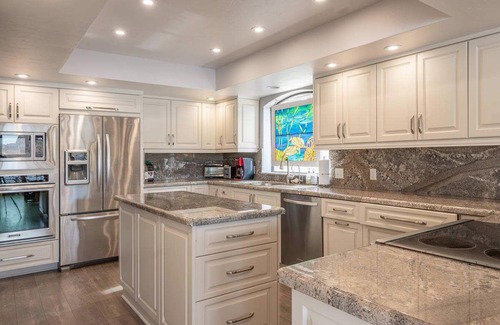 This spacious vacation rental includes a fully equipped kitchens and another kitchen downstairs, perfect for enjoying family meals or hosting events with friends. With five bedrooms and three bathrooms, this property comfortably sleeps up to twelve people, making it ideal for large families or groups of friends.