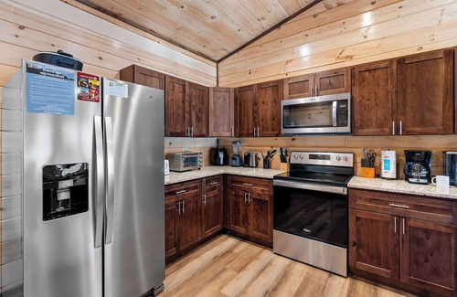 Swimming in the Smokies is a new addition to American Patriot Getaways. This beautiful property has 5 bedrooms and 4 ½ bathrooms and can sleep up to 12 guests. Located in Seymour just off of Chapman Highway, guests can enjoy easy access to Pigeon Forge and Sevierville where boundless activities await. Although, you might not feel like going anywhere once you see the blacklight game room and the private indoor pool. Even better you can relax in the jacuzzi tub inside or enjoy the scenic views from the hot tub outside. There is also plenty of seating in the dining area to enjoy meals made in the kitchen. And with the open-floor plan visiting between kitchen and living room is easy. This cabin offers quality family time right here in the mountains. Swimming in the Smokies cannot wait to welcome you! (ON MARCH 1, 2025, a Pickle Ball court is being installed!)