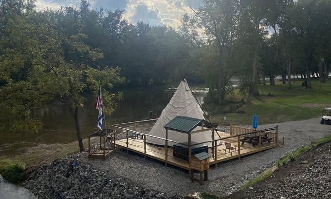 On the banks of the Indianas State river the Wabash . Just off your deck you are suroundded by water . Looking up you will see Bald eagle soaring above the majestic canopy of towering Cottonwoods , Shag Bark Hickory , Walnuts and state tree -Sycamore .Your lodge is a 20 20 ft Tee Pee . Beautifully decorated with era artifacts , modern bed ,fridge ,ice machine . and much more .( PLEASE understand the hot tub is an amenity .Due to the covid pandemic We have implemented a policy of draining the hot tub after each customer . Then cleaning the entire system! Which in turn is am costly expense . I have chosen to give the customer a option to pay for hot tub or decline . A CHOICE . Please advise in the rental process of your choice . )