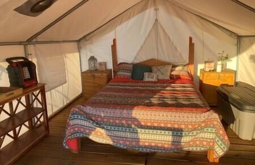 Tent is equipped with one queen bed that sleeps. Additional sleeping can be accommodated outside if you bring your own tent. Propane Heater is provided (guests to provide disposable propane cylinders). Picnic table and deck with 2 Adirondack chairs for enjoying the view. Non-flush Camp toilet and solar shower are provided.