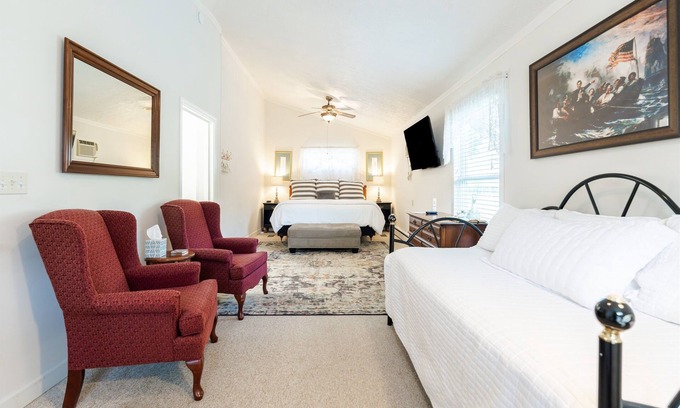 Relax in the sitting area, complete with two vintage queen wingback chairs and a table, or catch your favorite shows on the 55” flat-screen TV with Spectrum cable. Additional conveniences include USB-equipped bedside lamps, a classic dresser, and a mirror.