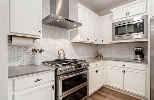 KITCHEN: Fully-equipped chef’s kitchen with stainless steel appliances, dishwasher, microwave, breakfast bar with seating, cooking basics, dishware/flatware, spices, complimentary coffee, creamer, tea and sweetener