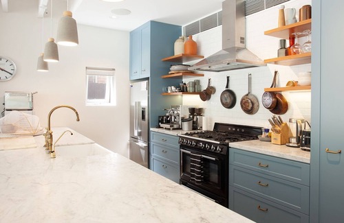 Whatever your group size, the bedroom arrangements don’t disappoint. The master on the top floor is a sanctuary in itself, housing a king bed, opposite a recessed, wall-mounted TV. Walk-in wardrobes are cleverly concealed, and there is a separate study space converted from a balcony, partitioned to the side. You can also access a private ensuite with a full bathtub and shower. The second bedroom on the ground floor is just as comfortable; deep blue walls cocoon a sumptuous queen bed, adding drama and elegance to your spacious room. An Eames-style chair is a designer nod next to the handy desk, and you’ve got plenty of storage with built-in wardrobes and shelves. The final bedroom also on the ground floor is a light and airy king-size bedroom that can be conveniently set up as two singles on request, with built-in shelves for belongings.