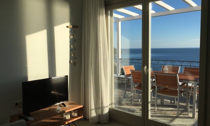 Almond Apartment: Studio apartment, at the upper floor, 54 m2 + 16.5 m2 balcony with a view to the ocean, two bedrooms (with extra small private balcony of the master bedroom), pull-out sofa in the living room, fully equipped kitchen which includes a coffee machine, dishwasher, oven, refrigerator, and stoves. Other additions to the room include air conditioning, free WIFI, bedding, towels, a barbecue pit, joined service room containing a washing machine, dryer, and multiple cleaning products. More additions include a television, a private parking space, a balcony with a view to the ocean, and a miniature playground in the garden.