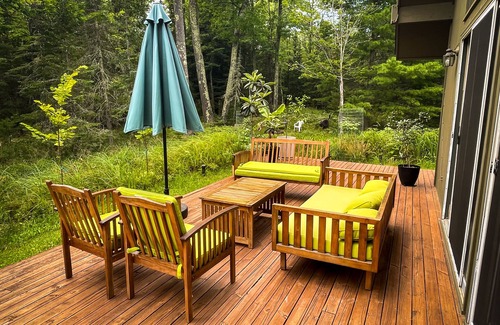 This stunning property features ample amenities tailored for wedding festivities. Inside, you'll find comfortable sleeping arrangements for up to ten guests, with options for more in cozy outdoor settings. The fully equipped kitchen invites you to whip up gourmet meals or celebratory treats, while the large deck and screened porch provide breathtaking views of the surrounding forest and creek, creating the ideal environment for outdoor ceremonies or receptions. Gather around the fire pit for enchanting evenings under the stars, or enjoy leisure time with your loved ones in the well-appointed living spaces.