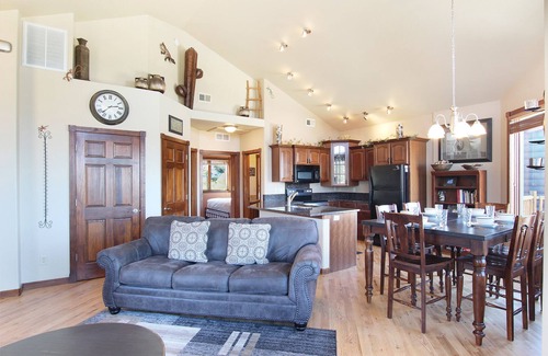 The open living area features a queen sleeper sofa, recliner, gas fireplace, flat-screen TV and magnificent mountain views. The kitchen is well-equipped with full-size appliances, a dining table that can seat six, a breakfast bar and everything needed for easy meal prep. The stacked washer and dryer are located in a closet off of the kitchen.