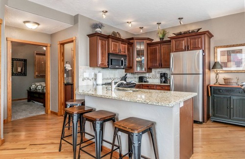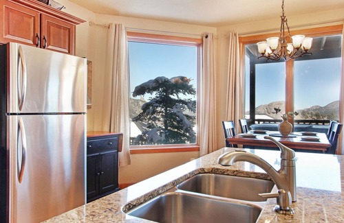 The open living area features a queen sleeper sofa, gas fireplace, flat-screen TV and magnificent mountain views. The kitchen is well-equipped with full-size appliances, a dining table that can seat six, a breakfast bar and everything needed for easy meal prep.