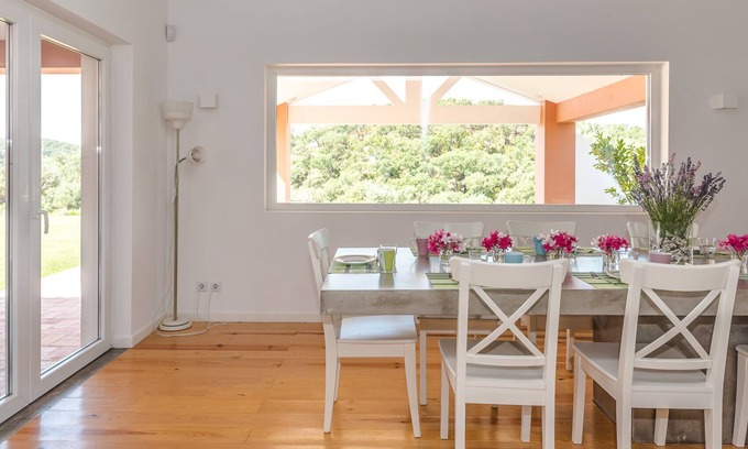 This villa is located in the Sierra de Grandola, in a quiet and peaceful place. It is 5 minutes drive from the nearest city. The closest beach of Aberta Nova is only 15 minutes away by car. Carvalhal / Comporta beaches are 20 minute drive away. This Villa has 7 bedrooms with wc: 4 rooms with double bed and 3 rooms with 2 beds. Beautiful views of nature and a large swimming pool All the house have AC and can be heated in winter. This special property is perfect for families and groups of friends
