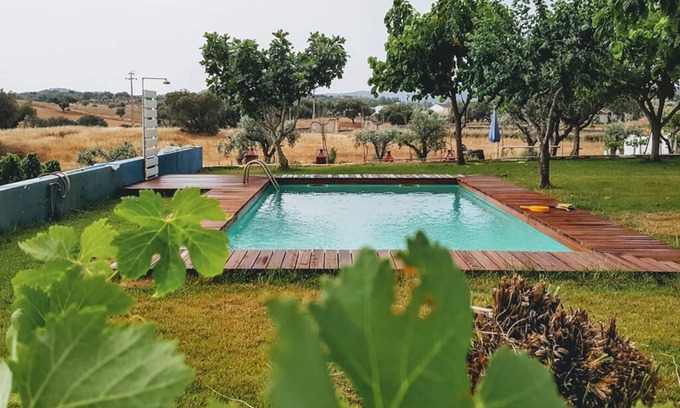 The Mount das Aranhad is a small wine estate (14 ha) within a region rich in cultural, gastronomic and wine. Mount è equidistant (10 km) from the village of Vimieiro and the town of Estremoz where there are supermarkets and restaurants and peculiar Fair of antiques and agricultural Saturday morning. However calm and pastoral beauty are the adjectives that best define our Monte. The Farm House is adjoining the house mother; It has two bedrooms with double bed and a small interior room with a bunk bed: the capacity is up to 6 people. You have a small private garden of 150m2 with porch and table. However the pool and its garden are common with the mother house; swimming pool, large garden and another porch are situated in front of the mother house and the country house. However you can enjoy all the valences of Monte: gardens, swimming pool, bicycles, barbecue, porches, etc. The lot is fenced (2 km from the main road but with other hills nearby) and pets are welcome.