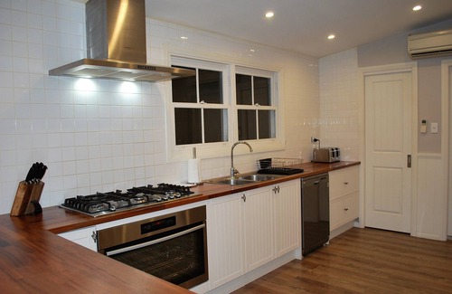The Cottage has a large verandah, and inside you'll find spacious living areas, a central fireplace, reverse-cycle air conditioning and sophisticated but relaxed furnishings. Two generous bedrooms, (1 king and 1 queen), and a comfortable double size sofa bed is located in the lounge room. A huge bathroom with double showerheads, laundry facilities and full kitchen with every appliance and utensil you will need including a coffee machine and pods supplied.