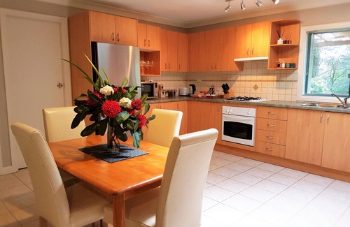 A full-size kitchen includes large stainless-steel fridge/freezer, LG dishwasher, double sink, microwave oven, gas cook top, electric oven and large pantry. All utensils, cookware, crockery, glassware and tableware supplied. A picture window overlooks the garden. Huge bathroom with double shower, vanity, toilet and built-in laundry. Spring and filtered water on-tap.
