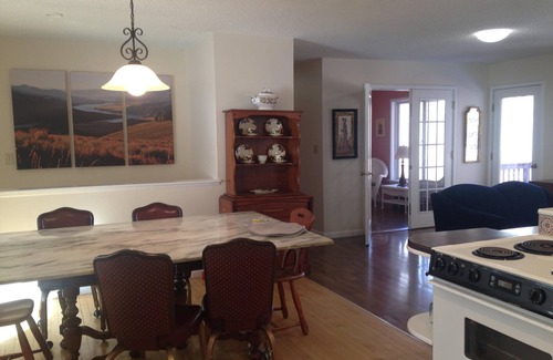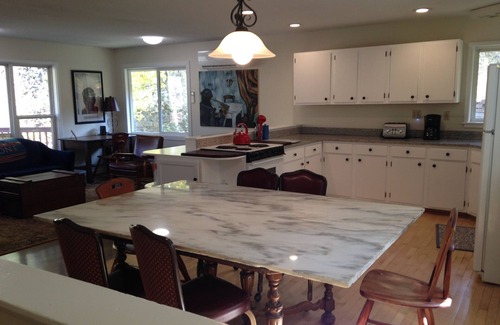 The house is really split into two separate apartments - one per floor. This works well for large family groups so they can eat all together in the huge kitchen upstairs, but have their own space with a small kitchen downstairs. The upstairs has two bedrooms, two bathrooms, a large open kitchen/dining area/living room, a huge deck, and a "music room" (piano!). The downstairs has two bedrooms, one bathroom, a laundry room, a dining area/living room with windows and glass door facing the pond.