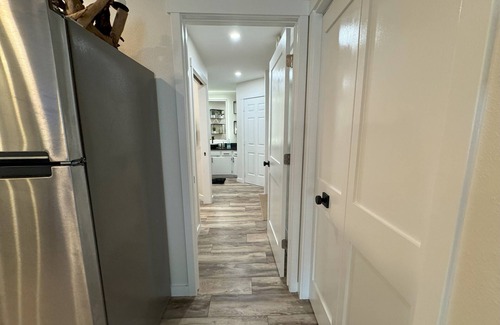 The master bedroom is a true haven designed for comfort and convenience. Featuring a king-size adjustable bed, you can customize your sleeping position for maximum rest. The room includes a 42” Smart TV and a HEPA air purifier to ensure clean, fresh air throughout your stay. A spacious closet provides plenty of room for your belongings. A dedicated workstation with a wall-mounted desk, 49” curved monitor, wireless keyboard, and mouse makes it easy to catch up on work or dive into your favorite digital entertainment.