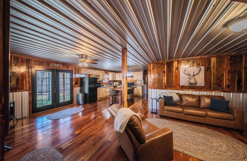 Unwind with family and friends at this peaceful, mountain-style cabin just minutes from Lake Barkley. Tucked away in a quiet, wooded setting, this spacious rustic retreat features 4 bedrooms, 4 full bathrooms, multiple living areas, and cozy pull-out sofas-perfect for large groups. The well-equipped outdoor space is ideal for relaxing or entertaining after a day on the water. Located only 0.7 miles from a state-maintained boat ramp on Lake Barkley and just 8.9 miles from prime fishing below the dam, this cabin is a great base for lake adventures. You're also close to local attractions and great dining. Bring your boat or extra vehicles-there's plenty of parking and room to spread out.
