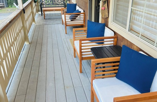 FRONT DECK| Covered entry deck with smart lock access on the front door, chairs and bench seats with side tables