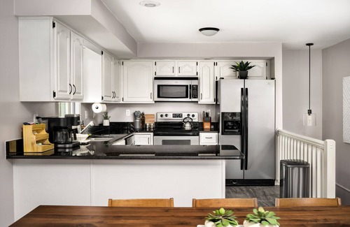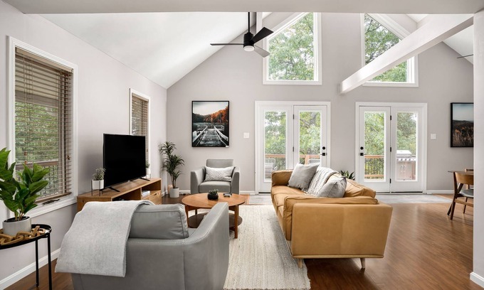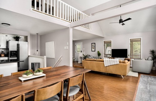 The main level features a master bedroom (king bed) & second bedroom (queen bed); two full bathrooms (one attached to master); and an open-concept living space that includes a kitchen, living, and dining room with lofted ceilings. Inside the kitchen you'll find silverware, dishware, pots, pans, single serve pod & pot coffee maker, tea kettle, coffee & tea, dishwasher & dish soap, cooking utensils, and other necessities that you’re used to at home. The living room includes plenty of comfy seating to sit and relax on while you enjoy a movie! The dining room features a large dining table to seat friends and family for a nice dinner.