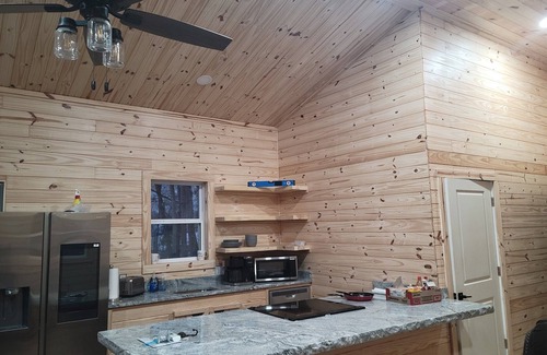 This is a new construction cabin at the top of a mountain with an amazing view. It has a 7 person private hot tub, full kitchen, washer and dryer, shower with endless hot water, grill and WiFi. Warm and cozy