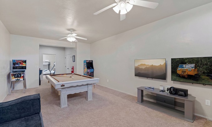 Downstairs, the expansive game room is the heart of the fun, featuring a pool table, classic arcade machines like Pac-Man, Xbox, Sega, and a wide selection of board games. Dual TVs make it easy to enjoy multiplayer gaming or movie nights, and a pull-out sofa bed offers extra sleeping space when needed.