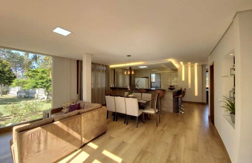 Enjoy the delicious mountain climate. Beautiful house with two rooms, one TV with 70'' and access to Netflix and SKY; and another 50'' smart TV. Living room with fireplace and panoramic glass overlooking the full moon and starry sky. Two kitchens equipped with side by side refrigerator with water and ice dispenser, stove, coffee maker, microwave and airfryer. Steam room with panoramic view and shower room. Heated swimming pool with chromotherapy for night use, The house has a cozy decoration and mountain style. Bright garden with another beautiful outdoor fireplace with benches and swings to enjoy a good wine with the view of the sky. The garden also has beautiful fountains in a classic style to relax with the sound of the water. The house also has a master suite with a whirlpool with chromotherapy and a beautiful view.
