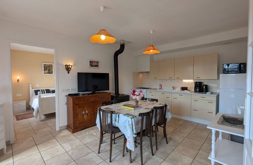 - A living room with a dining area for 6 people. A lounge area with a coffee table and sofa. Kitchen: 4-burner stove, refrigerator with freezer compartment, microwave, filter coffee maker, raclette grill, immersion blender, pressure cooker, kettle, and toaster. A fireplace stove (wood provided).