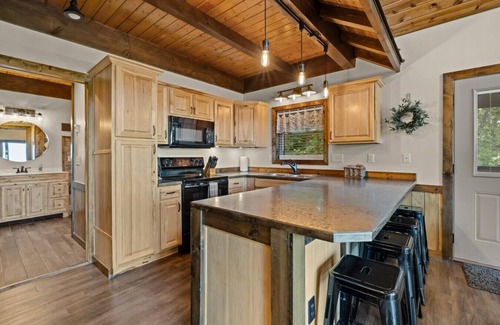 This cabin has an open concept kitchen/dining room and living room, lined with a wall of huge windows to enjoy the stunning views of the Arkansas Grand Canyon.