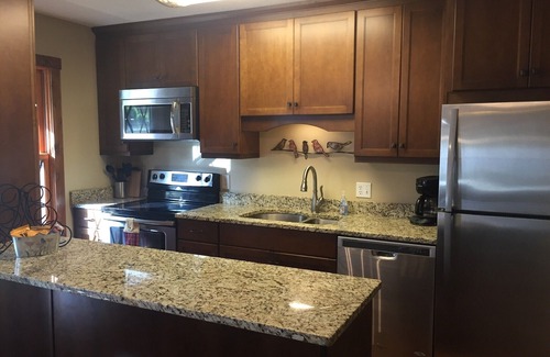 The kitchen has granite countertops and stainless appliances. There is a full-size stack washer/dryer in the cabin.