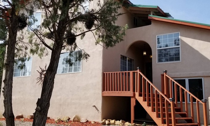 Whether you want to spend time outdoors, drive the turqoise Trail, or explore everything Albuquerqe has to offer, this is a large mountain home on 2 acres. 3 bedrooms upstairs with a hallway bathroom, and a Master bedroom with luxurious private bathroom. Downstairs, there is a family Game room, a Kitchen stocked with essentials, a large Dining room, and a Living room and guest 1/2 bath. Streaming all your favorite programs on a new Roku TV. Wifi is provided with password. Back porch has pleanty of room to store mountain bikes or skiing gear as well as a propane BBQ for fun meals. On the 2 acre find and an outdoor swing, hammock, meditation garden on the top and fire pit area for roasting Marshmellows, weather permitting. House has central heating and AC to make you comfortable at 7800 feet altitude. All linens provided, and a NEW LAUNDRY ROOM! Come Unplug and Engage with Nature!